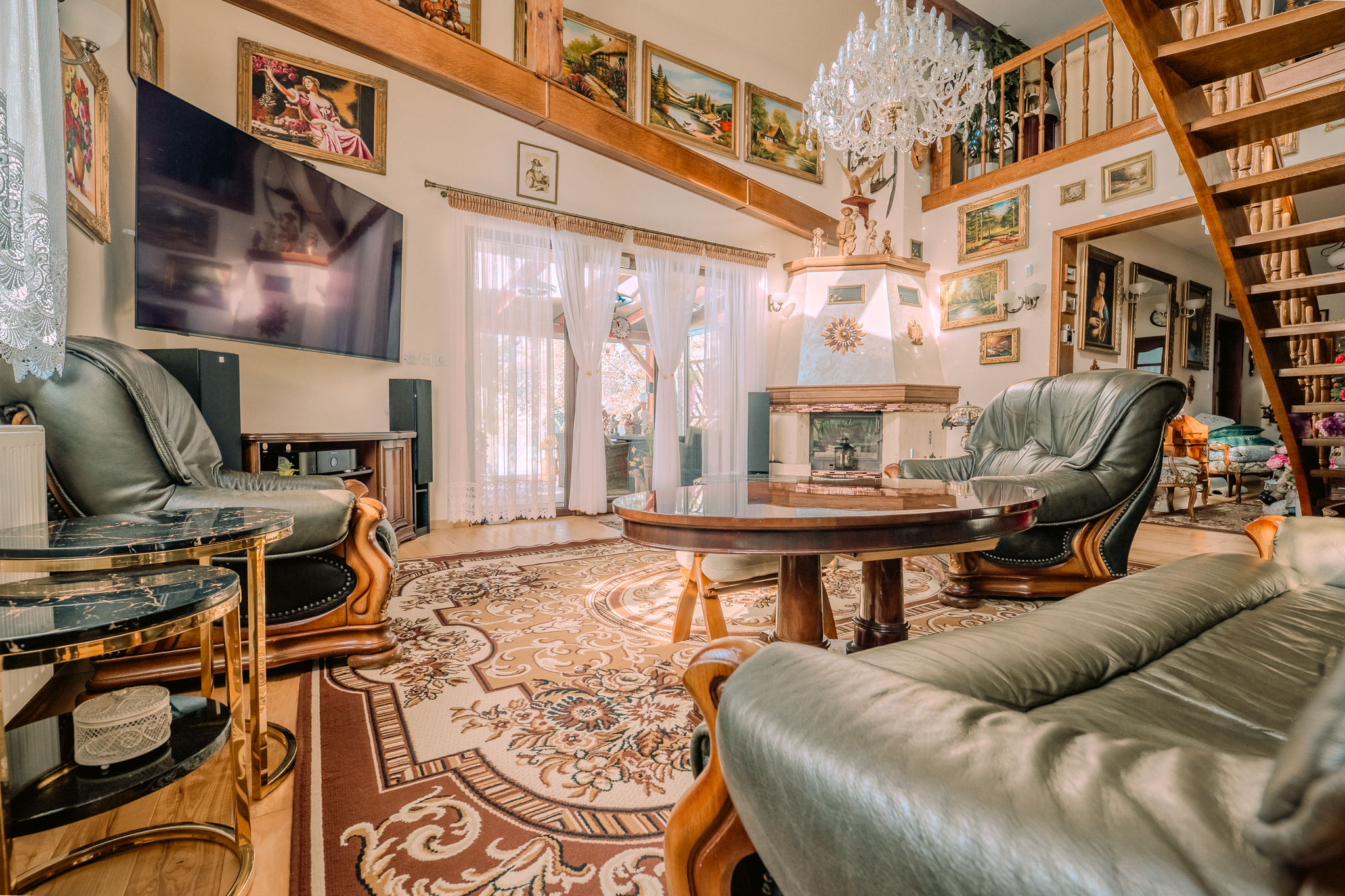 przestronny salon z kominkiem i wyjściem na przeszklony taras zewnętrzny